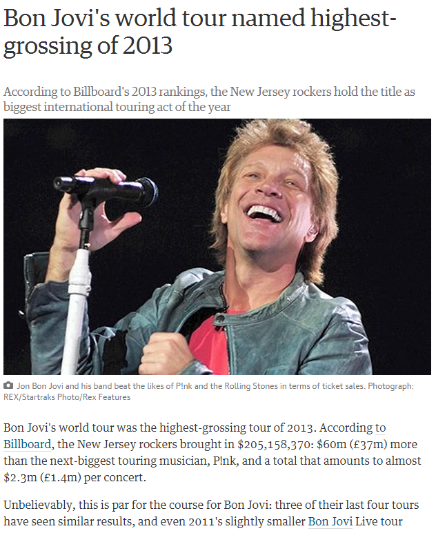 그리고 전세계에 콘서트를 돌면서 전좌석 매진 행렬이 이어지는 경우는 상당히 쉬운일이 아니며 2013년에는 콘서트 수입3 1위를 (3억 달러 상당)기록했다는 점들을 감안할 때, 본조비의 매력이 시간이 지나갈수록 돋보이는 매력이 존재하는 밴드이기도 하다.