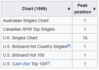 이를 다룬 노래였음에도 영국 싱글차트 16위에 올랐을 정도였고, 당연히 미국 빌보드 컨트리 싱글 차트 1위, 빌보드 Hot 100차트 1위, 1959년 연간 빌보드 누적 차트 1위를 기록한다.